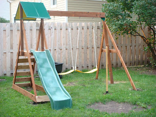 We decided to get the kids a swing set from Menards since it was only $119.00. It's pretty small but has a slide and 2 swings. We spend a lot of time in the backyard now that Jeremy built a gate. Jeremy working hard Digging the holes. All finished! Robert swinging. Love that smile. Climbing up the slide. Going down the slide.